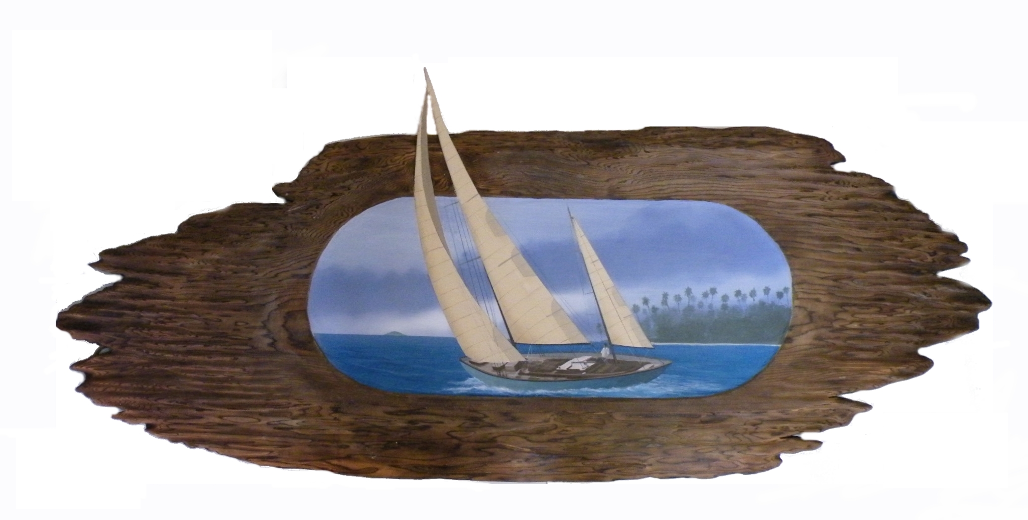 Goodbye Coconuts Island Ⅱ BOARD-PAINTING 2021.02.182009.11.28 ココナッツアイランドから出向する大型クラシックヨットです。セールが額から飛び出している部分は、ベニヤ板をカットし張り付けました。 2009年11月28日