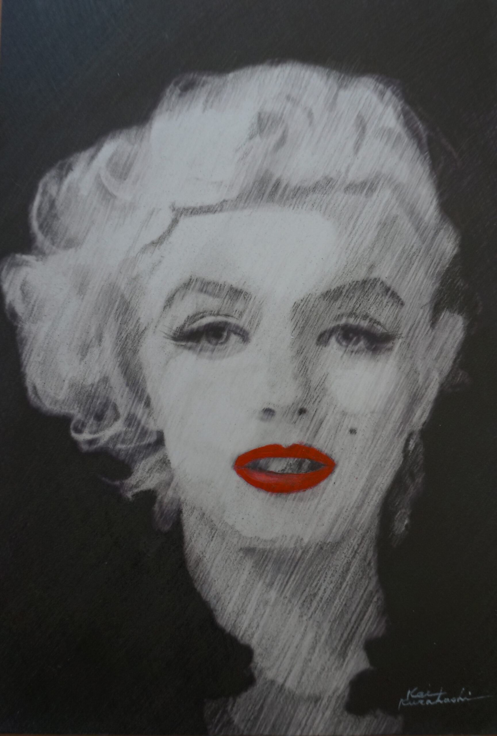 Marilyn BOARD-PAINTING 2021.02.152017.01.24 T この作品は Marilyn Monroe を描いたもので、シリーズ第2作目となります。第1作目の”The Strongest Marilyn ”を描くために、彼女の写真を集めていた時に、この作品の元となる写真を見つけました。個人的には彼女が一番美しかった頃だと思います。鉛筆で描いた白黒の作品ですが、ちょっと彼女には似付かわしくないと思い、唇に紅をさしました。 原材料 : イラストボード 鉛筆(2H~6B) アクリル絵の具全 長 : 20cm × 29CM 個人所有 2017年01月24日