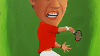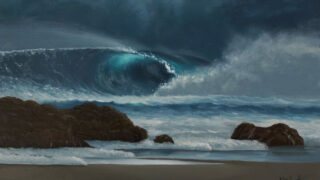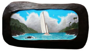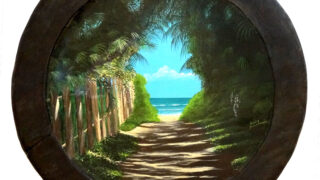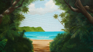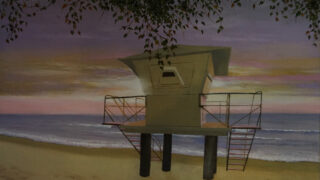 この作品は2010年に描いた絵と同じ構図で、前回はアクリル絵の具でしたが、今回は油絵具で描いています。これはワイキキビーチにある Lifesaver tower の夕暮れを描いています。浜辺に残された無数の足跡で、一日...
