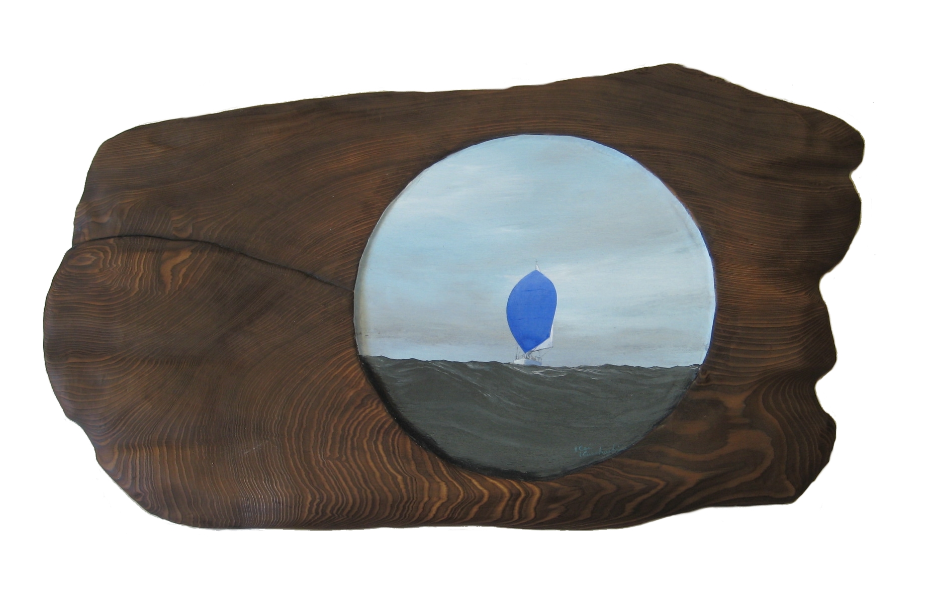 Courageous Voyage BOARD-PAINTING 2007.11.26 追い風の荒れた海を走るクルーザーです。 ブルーのセールは追い風用のSPINNAKERです。 2007年11月26日