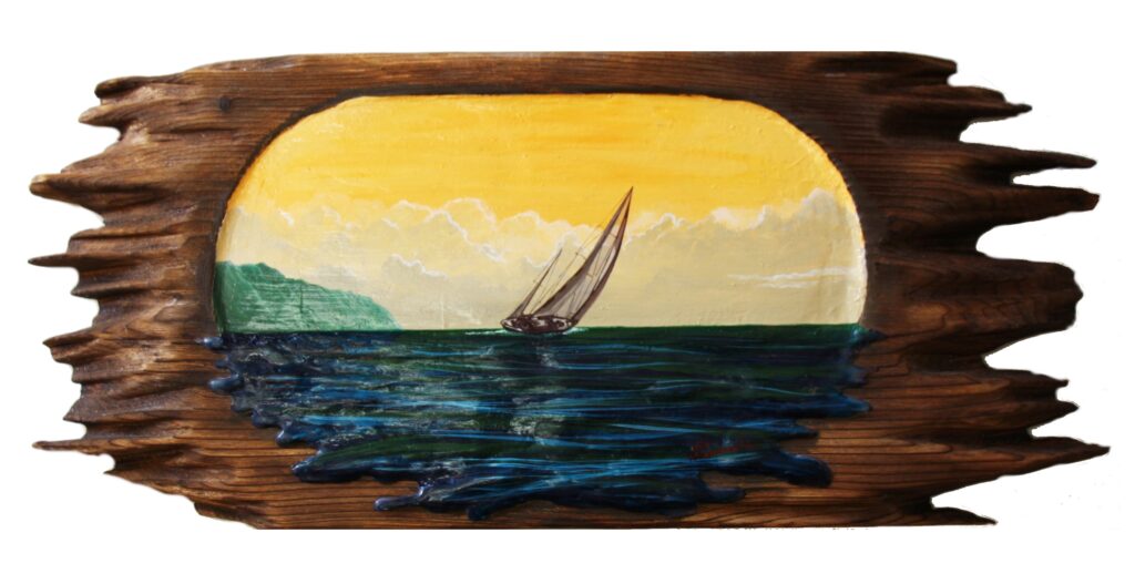 Evening Sailing BOARD-PAINTING 2021.02.172010.02.07 暮れ行く海を公開するクラシックヨットです。 Seabornia Sweet Heart’s 船内に展示。 2010年02月07日