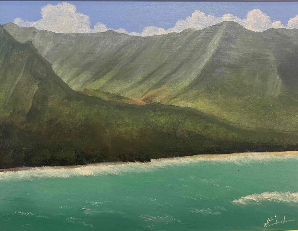 去ハワイ島北部にある美しい渓谷です。 霧に霞んだ山がとても神秘的です。 原材料 : カンヴァス F6号(41cm × 32cm) 2025年5月14日