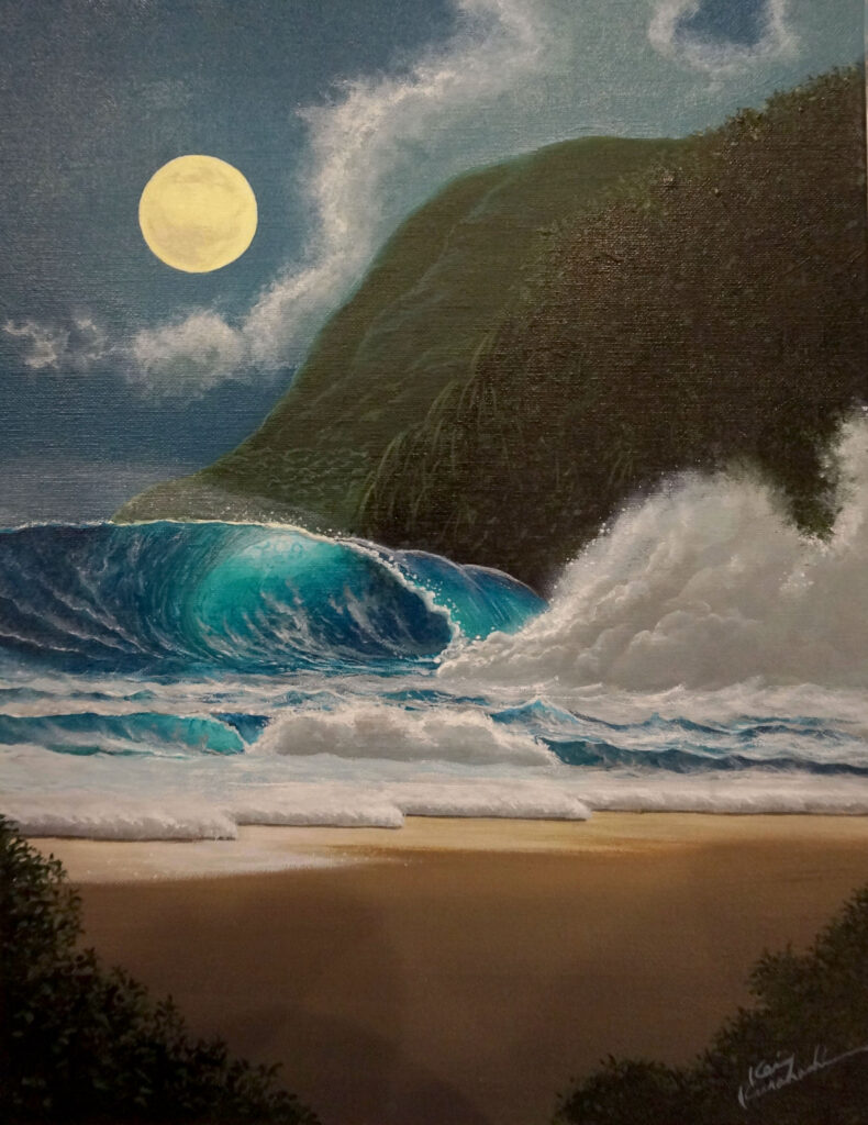 真夜中に強風の中で暴れる波を描きました。2014年12月、師と仰ぐRoy Tabora氏(ハワイ在住)の自宅兼アトリエに招待され、3時間もの間、実際に絵を描きながら技法や考え方を教わりました。…