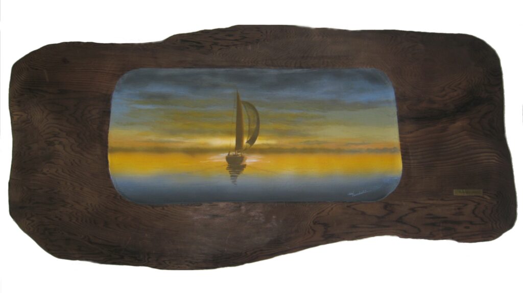 この作品は8年前に描いた作品のリメイクです。僕の作品は生の木に描くのが大きな特徴ですが、キャンバスを作る作業に多大な時間と労力を要します。このキャンバス作りは何種類もの電動機械を使うので怪我をする…