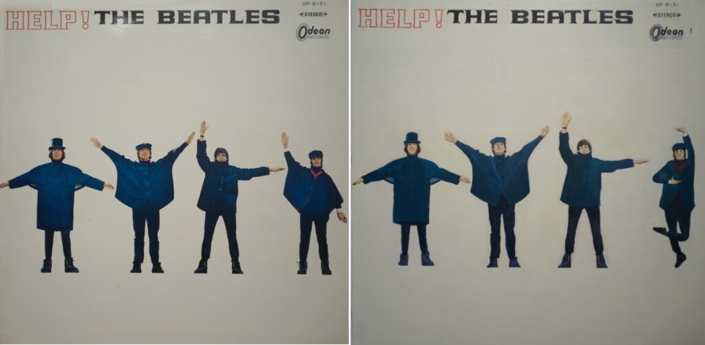 散歩の途中、カフェの窓に飾ってあったBeatlesの”HELP!”を見たときに思いつきました。左側が本物のレコードジャケット、右側が作品です。Ringo Starrが見たら怒るかな? 2…
