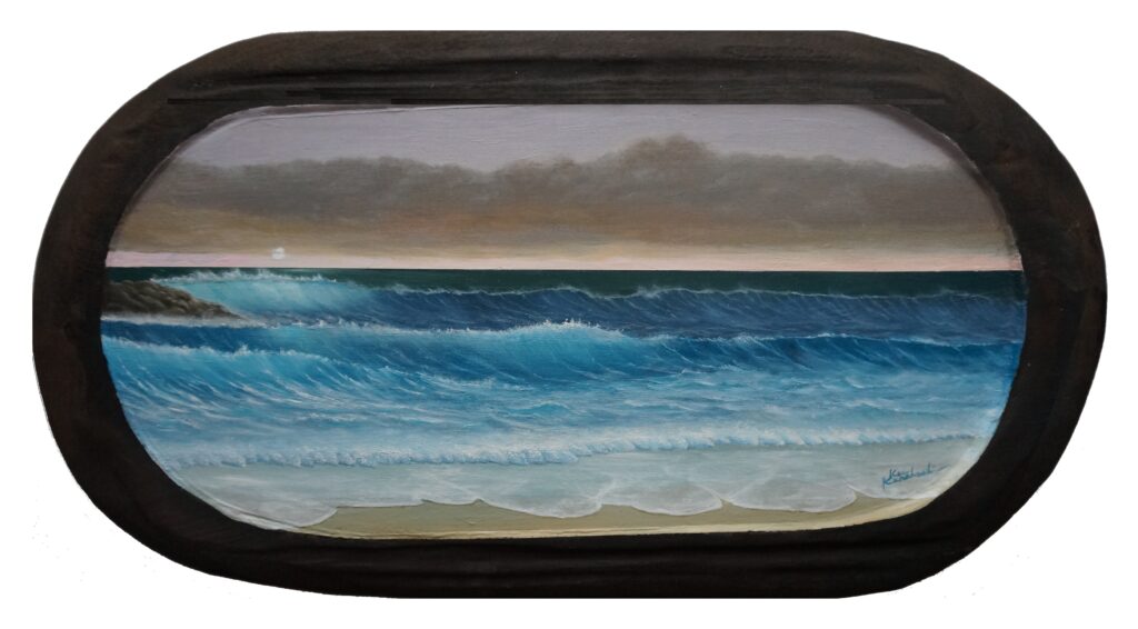 T この作品は油絵で初めてのボードペインティング(木に直接描く)です。ハワイオアフ島ノースショアの荒波の海に沈む夕日をイメージしました。原材料 : けやきの板油絵具全 長 : 76cm × 41cm …