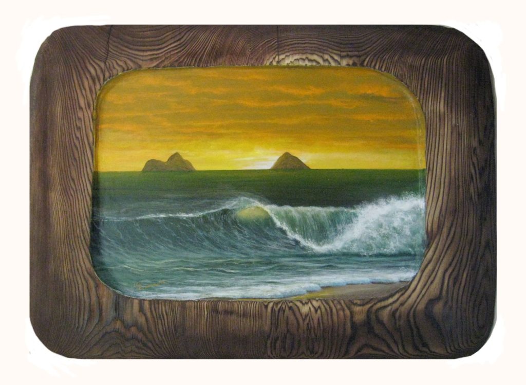 Mokulua Island Ⅱ BOARD-PAINTING 2008.03.10 ハワイに行くとかならず立ち寄るLANIKAI BEACHの象徴的存在のMOKULUA ISLANDSです。 夜明けがきれいなので、真っ暗なWAIKIKIから車を飛ばして見に行きます。 2008年03月10日