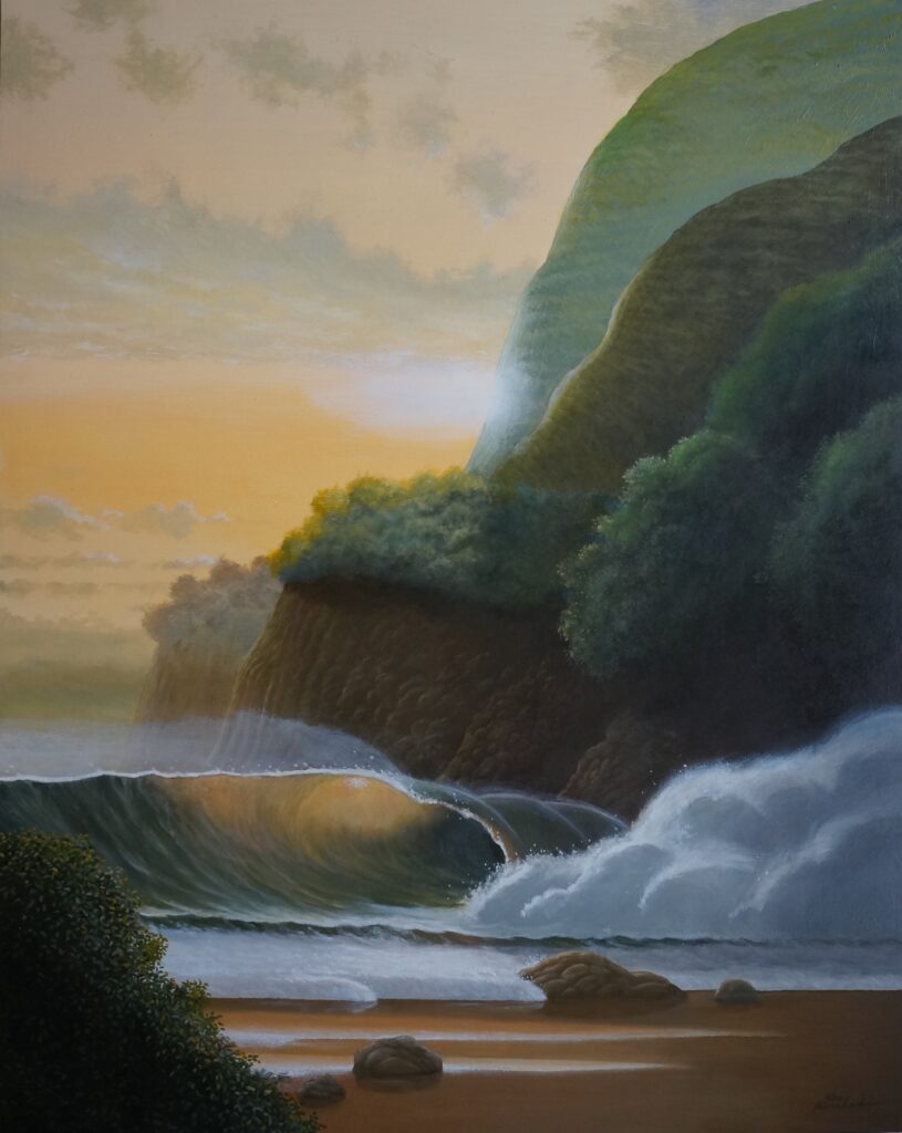 The Fifth Wave BOARD-PAINTING 2021.02.152017.07.02 T 5回目の個展(3年に1度開催)のメインの作品です。大好きな夜明けのビーチを描きました。 原材料 : ウッドパネル油絵具全 長 : 91cm × 73cm 2017年07月02日
