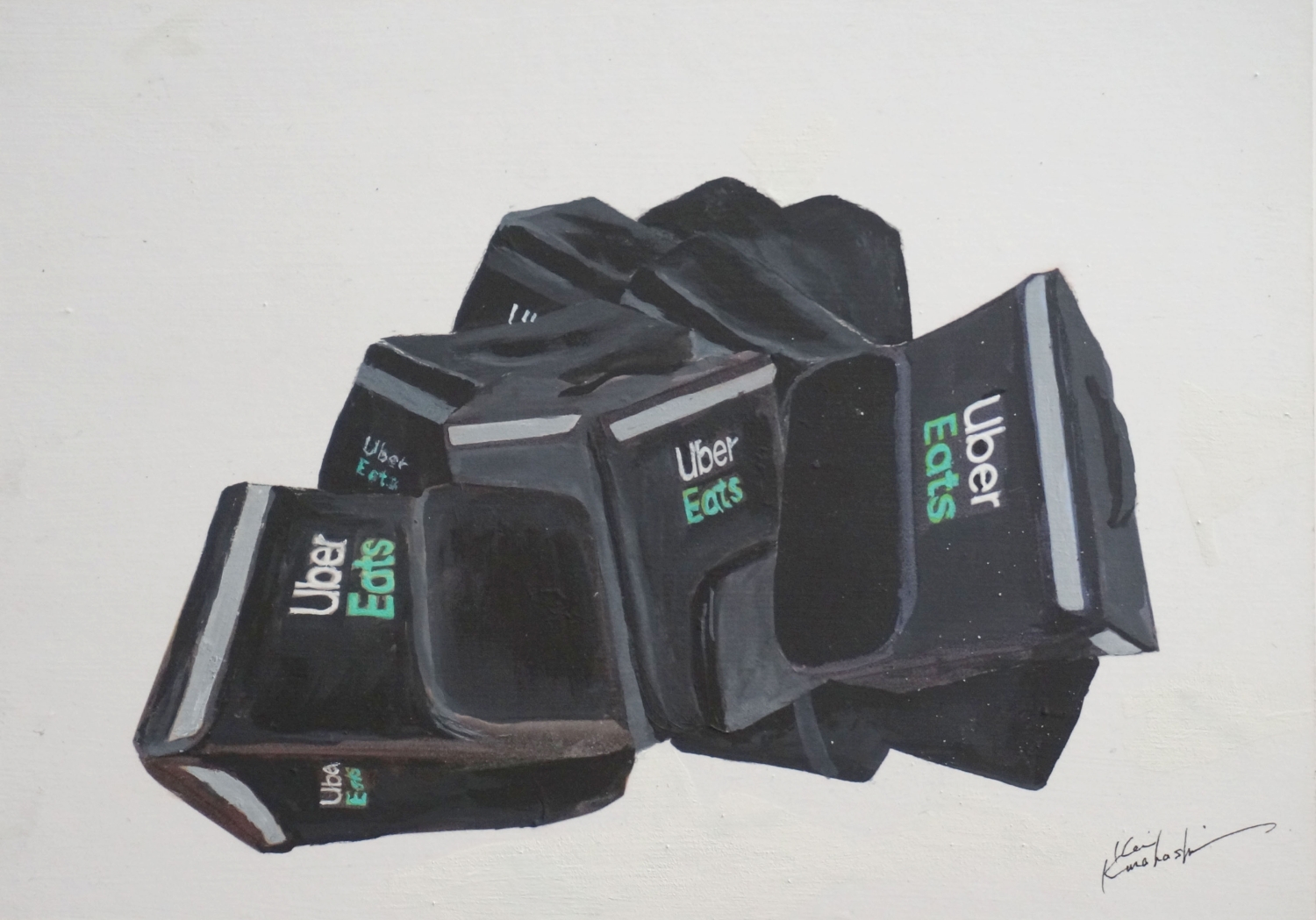 Uber捨て山 BOARD-PAINTING 2022.07.272022.02.27 街中にUber Eatsの黒いバッグを背負った若者が溢れていますね。このバッグの希望者が多すぎてバッグの価格にプレミアムがついてるようです。これも新型コロナの影響が大きいでしょうね。この作品は新型コロナが収束した後は、このブームも過ぎ去りこのバッグも需要がなくなるんじゃないかなって、願いを込めて描きました。 原材料 : イラストボード A4 リキテックス 2021年02月28日
